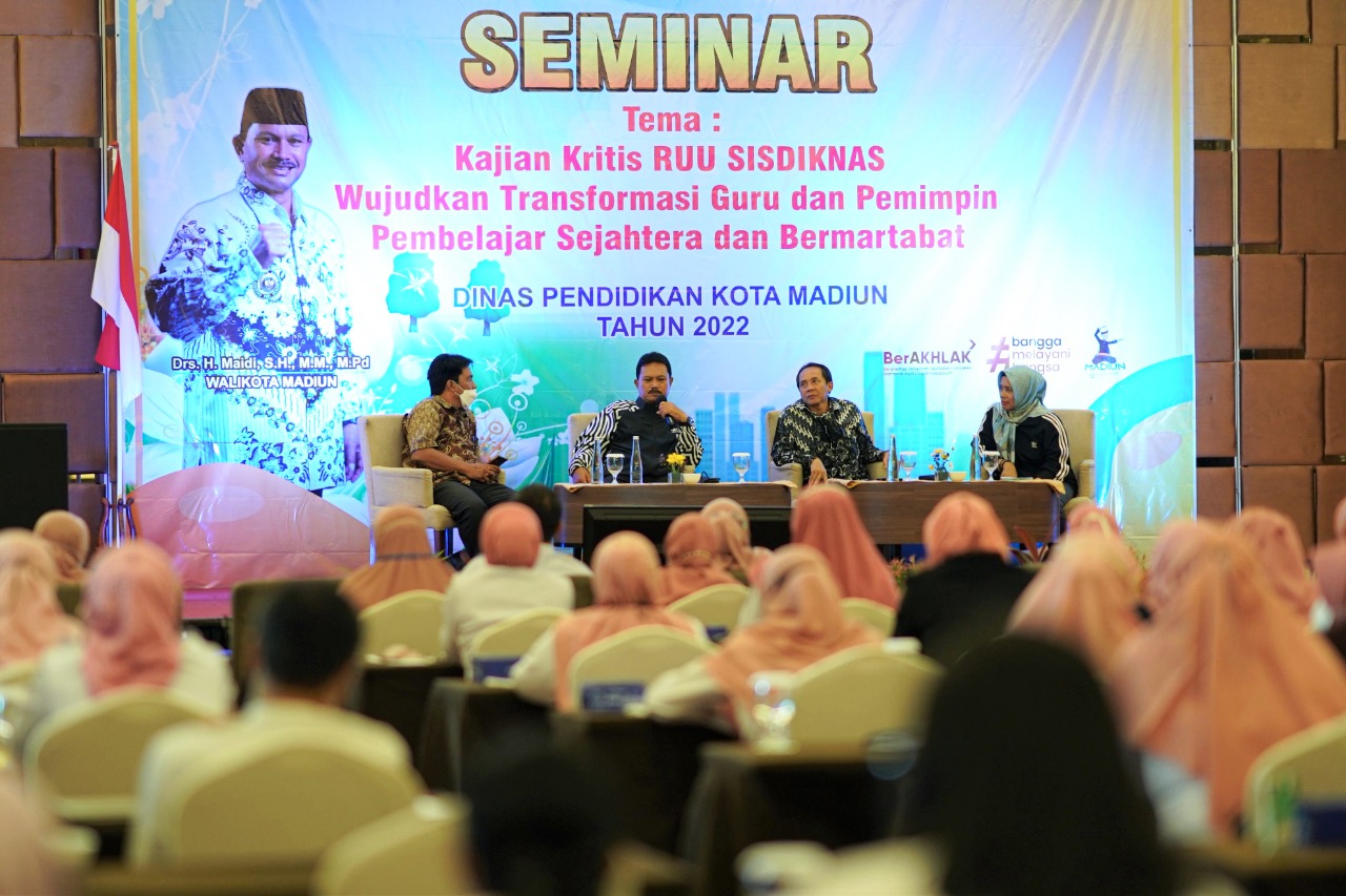 MADIUN - Pada Agustus 2022, Kemendikbudristek menggulirkan Rancangan Undang-Undang Sistem Pendidikan Nasional (RUU Sisdiknas) untuk meningkatkan kompetensi pendidikan di Indonesia. RUU Sisdiknas inipun mendapatkan perhatian Pemkot Madiun. Melalui Dinas Pendidikan, mereka menggelar Seminar RUU Sisdiknas. Kegiatan tersebut berlangsung di Bima Ballroom Aston Hotel Madiun, Rabu (30/11). Wali Kota Madiun Maidi pun hadir sebagai narasumber. Sebagai pejabat yang berangkat dari dunia pendidikan, wali kota pun memberikan perhatian tersendiri terhadap bidang tersebut. Menurutnya, pendidikan merupakan kunci mengentaskan kemiskinan dan meningkatkan kesejahteraan masyarakat. "Orang lapar jangan dikasih makan. Makanan habis, dia lapar lagi. Tapi ajari caranya mencari makan," ujarnya. Analogi tersebut merupakan penggambaran upaya peningkatan kesejahteraan masyarakat yang dilakukan oleh wali kota. Yakni, dengan memberikan kesempatan meraih pendidikan yang lebih tinggi kepada anak-anak keluarga kurang mampu melalui beasiswa. Dengan mendapatkan pendidikan yang lebih tinggi, membuka kesempatan seseorang untuk bekerja di sektor yang lebih baik. Sehingga, dapat meraih pendapatan yang sesuai. Serta, meningkatkan kesejahteraan keluarganya. Tidak hanya itu, memajukan pendidikan juga penting dilakukan. Salah satunya dengan meningkatkan kompetensi guru. Wali kota pun mengimbau guru untuk terus belajar. Bahkan, sekolah yang lebih tinggi agar membuka pengetahuan yang lebih luas. "Agar semangat, misalnya kepala sekolah memberikan hadiah beasiswa bagi guru berprestasi. Saat ini ada banyak beasiswa profesi di Kota Madiun. Jadi tidak ada alasan untuk tidak mengembangkan kompetensi diri. Sementara itu, RUU Sisdiknas merupakan upaya dan strategi baru untuk meningkatkan kualitas pendidikan yang masih rendah tersebut melalui tiga pilar utama. Yakni, mengurai hambatan birokrasi perundang-undangan, menyederhanakan sistem pendidikan yang kaku, serta membenahi kualitas dan kesejahteraan guru. RUU Sisdiknas masih menjadi pembahasan di tingkat nasional. Harapannya, rancangan undang-undang tersebut bisa tersusun sempurna dan mampu memenuhi kebutuhan pendidikan Indonesia sebelum akhirnya disahkan menjadi undang-undang. (Dspp/irs/diskominfo)